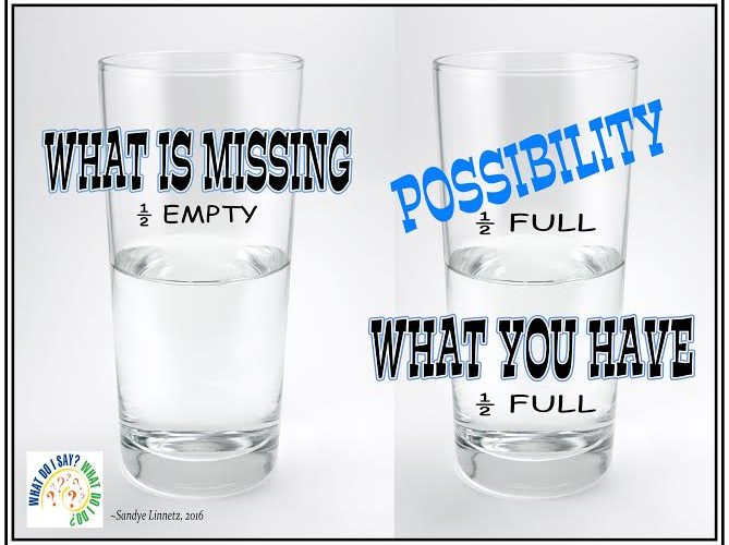 But the value of a positive ‘see the glass as ½ full attitude’ about life is not the whole idea behind my blog today. The real question I pose is this: You may think you have a positive outlook, but are you REALLY a ½ full person? Most of us claim to be, but that positive outlook shows up in our speaking as well as in our thoughts! What are you saying and what are you thinking? What do you notice first about the people and the world around you?